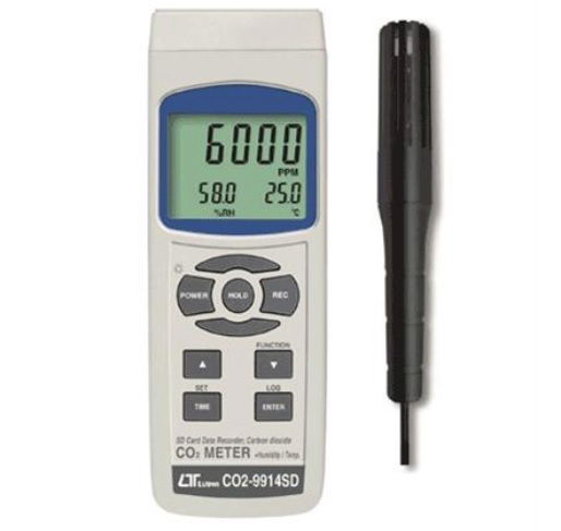 CO2-9914SD 二氧化碳/溫濕度測量儀 1.單隻探棒偵測 二氧化碳CO2/空氣溫度Temp 濕度%RH/露點溫度Temp 乾球溫度Dew、濕球溫度Wet 2.二氧化碳範圍:0~10000ppm CO2有高度補償功能 精度詳見目錄 ±(50ppm +5% of reading) 3.溫度範圍:0~50.0℃±0.8℃ 4.濕度範圍:5~95%±3% 5.露點溫度:-25.3~48.9℃ 6.可記錄最大值,最小值及讀值鎖定功能 7.RS-232/USB連接介面+軟體(選購) 8.尺寸:177*38*45mm